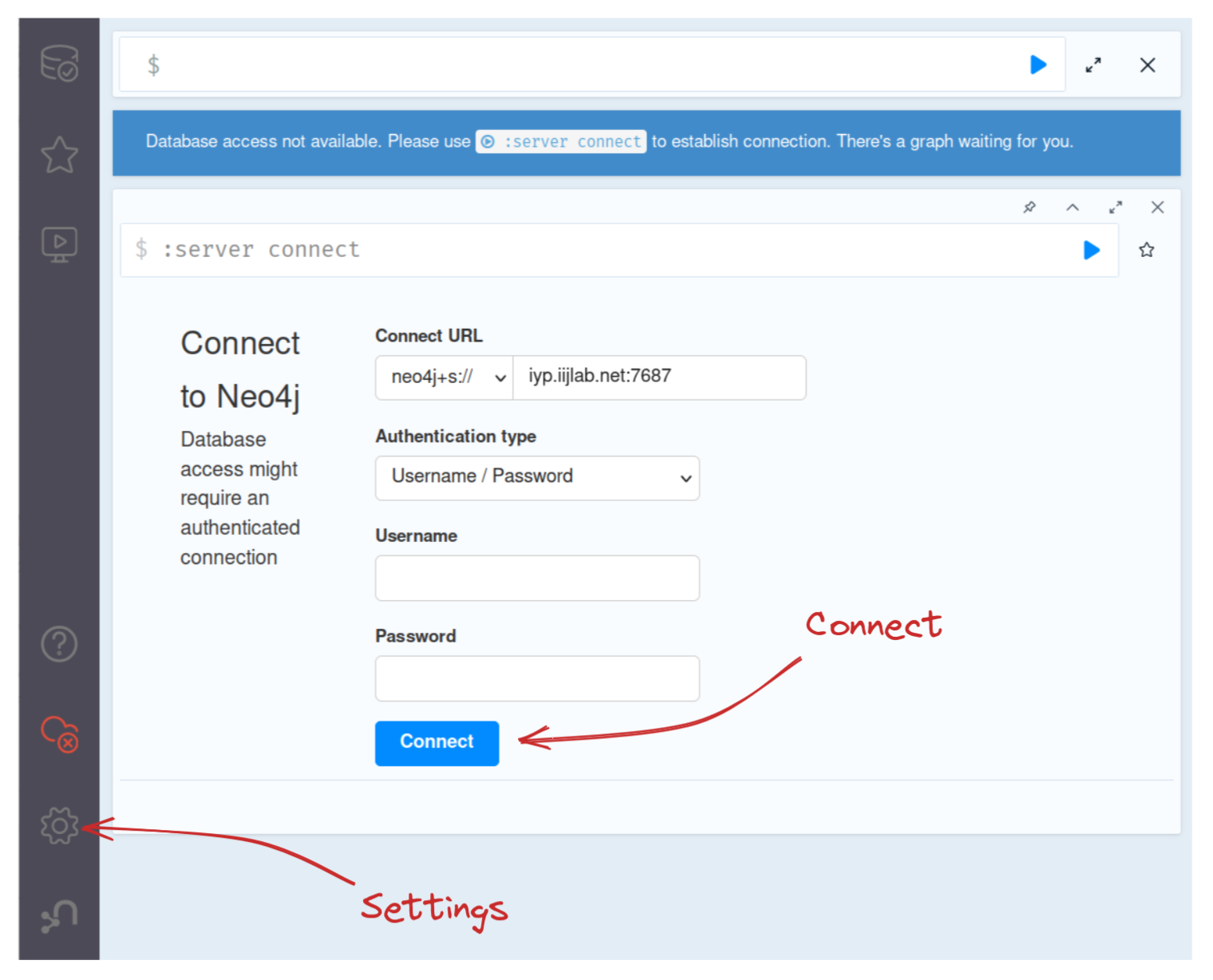 To query the IYP database, go to https://iyp.iijlab.net/iyp/browser/, enter 'iyp-bolt.iijlab.net:443' in the 'Connect URL' field and click on the 'Connect' button. No Username/Password is required.
